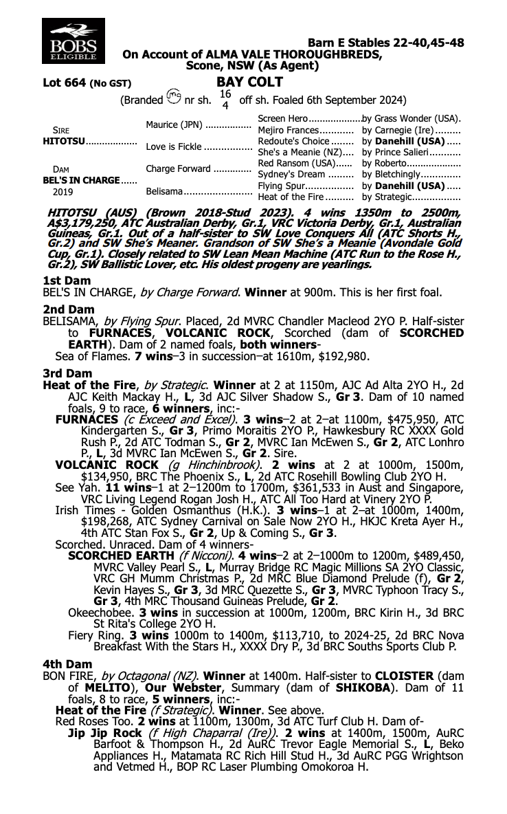 This colt is sired by Hitotsu, a remarkable first-season champion who won the Group 1 VRC Derby, AJC Derby, and Australian Guineas, marking the first such achievement since Mahogany in 1994.