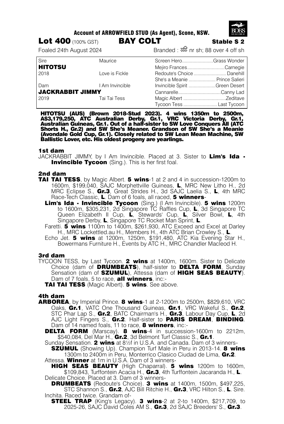 Out of I Am Invincible mare Jackrabbit Jimmy, from the black-type family of Tai Tai Tess.